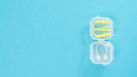 Nose clip and swimming earplug in a transparent case on a blue background