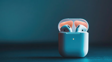 This image features wireless earbuds in a charging case, resting on a dark surface illuminated by soft blue light. Perfect for showcasing modern audio technology.