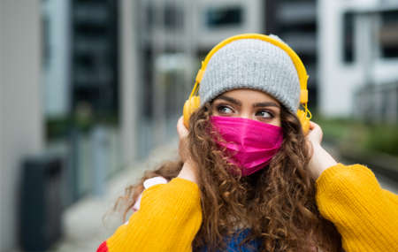 Isolated, red wireless headphones with blue surgical mask on a white background. A concept that shows that music, entertainment and fun is not over during pandemic.