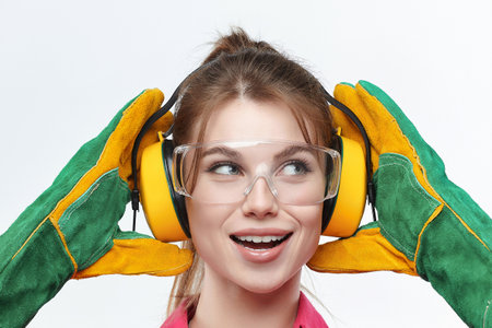 Close up male hand civil engineer holding earmuff standing on isolated white background. Mechanic home service concept.