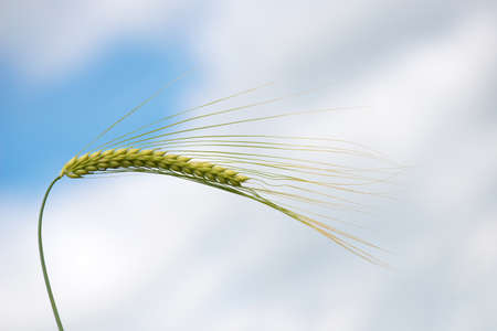 Single green barley plant against blue spring sky. Barley grain is used for flour, barley bread, barley beer, some whiskeys, some vodkas, and animal fodder. Space for text