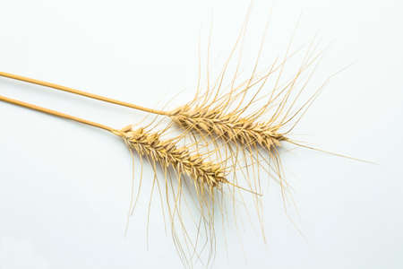 Wheat on a white background close-up mock up. Wheat harvesting season, harvest festival. Copy space.