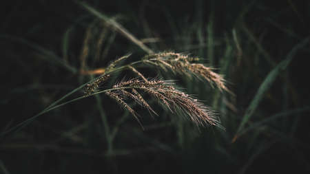Weed grass grains hitting sunlight dark background.