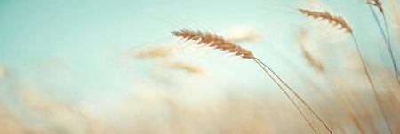Golden wheat stalks are swaying gently in the summer breeze, creating a tranquil scene under a clear, pastel colored sky, evoking the peace and abundance of nature