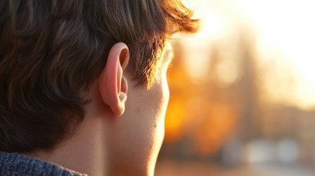 A captivating close-up of a young woman's profile, showcasing her ear and natural skin texture illuminated by soft sunset light, evoking feelings of beauty and tranquility.