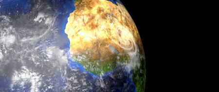 Planet earth with realistic geography surface and orbital 3D cloud atmosphere . Outer space view of world globe sphere of continents . 3D rendering graphic . Elements of this image furnished by NASA .