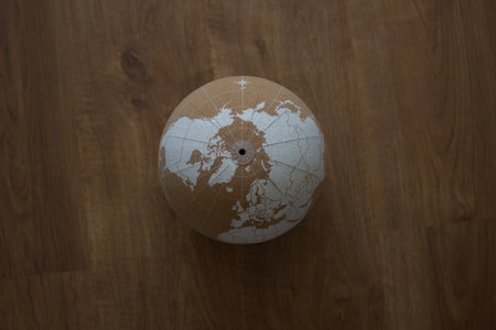 cork world ball with white political map on brown wooden background, visualized the northern hemisphere horizontal top view