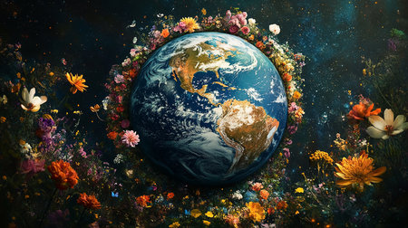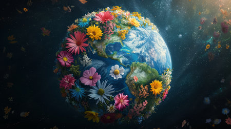 Realistic portrayal of Earth showcasing continents adorned with vivid flowers, creating a beautiful and vibrant image symbolizing the interconnectedness and natural beauty of the planet's floral diversity Generative AI