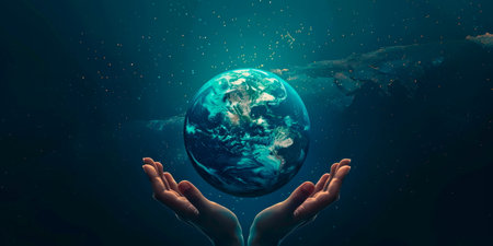 A person's hands cradle a miniature globe, showcasing Earth's continents and oceans. The image displays a close-up perspective with soft lighting and a shallow depth of field. This visual emphasizes concepts of environmental responsibility and global interconnectedness. Suitable for diverse applications, including educational content and illustrative materials.