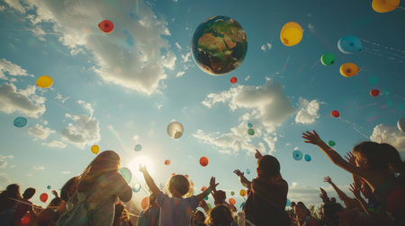 Multicultural group of happy and diverse people from around the globe coming together in unity to celebrate earth day. Showing their commitment to environmental conservation and sustainability.