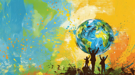 AI Generated - Group of people standing in front of a painting of a globe, holding a banner with the words Earth Day written on it. Commercial illustration artwork for business applications.