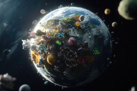 A stunning visual of Earth amidst rocky debris, highlighting the planet's fragility in the vast cosmic space. The image serves as a reminder of environmental vulnerability.