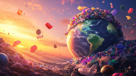 Surreal depiction of Earth surrounded by plastic waste at sunset, illustrating the urgent need for environmental awareness and action against pollution.