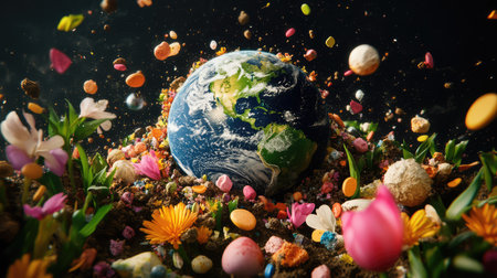 This imaginative image features a globe surrounded by an array of colorful candies and vibrant flowers, evoking a sense of joy and creativity in a delightful natural setting.