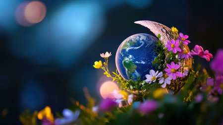 Earth nestled in a flower-covered moon, symbolic balance between cosmic and natural beauty