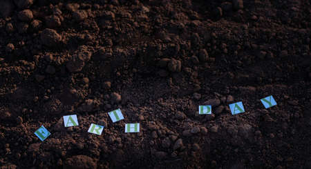 A young plant emerges from dark soil, symbolizing hope and renewal for Earth Day. A small wooden sign reads Earth Day, promoting environmental awareness.