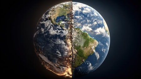 A split image showing Earth before and after global warming, with one side vibrant and the other desolate.