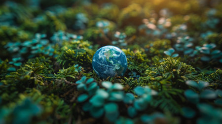 A stunning blue and green globe rests amidst lush greenery, symbolizing Earth's natural beauty. This tranquil scene is perfect for environmental themes.