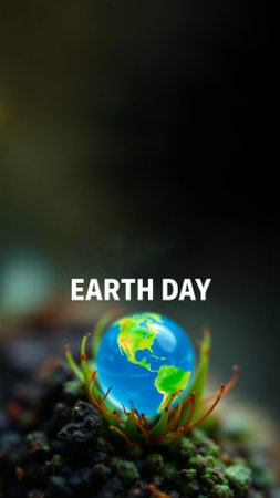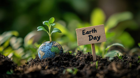 A small globe with a fresh sprout and a sign marking Earth Day sits in rich soil, symbolizing hope and sustainability for the planet's future.