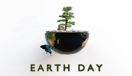 A vibrant small globe sits beside a sprouting plant with an Earth Day sign, symbolizing environmental awareness and the importance of nurturing our planet.