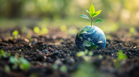 This captivating image features a small globe with a green tree emerging from the soil, symbolizing environmental growth and sustainability. The blurred background enhances the message of nurturing nature.