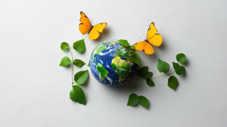 Eco-themed Earth wrapped in leaves and butterflies, symbolizing peaceful coexistence