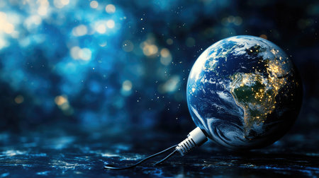 A striking depiction of Earth connected to a power cord, reflecting the relationship between modern technology and environmental sustainability, encouraging reflection on energy solutions.