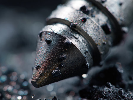 Close-up of a metallic drill bit with textured surface, partially embedded in dark, sparkly rock pieces. The focus is sharp on the drill tip, highlighting its rugged design