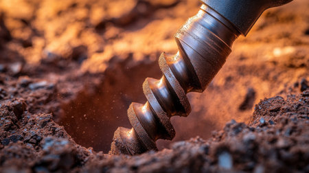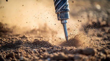 A captivating close-up image of a power drill bit in action as it penetrates the soil, sending up sparks and debris, showcasing construction dynamics.