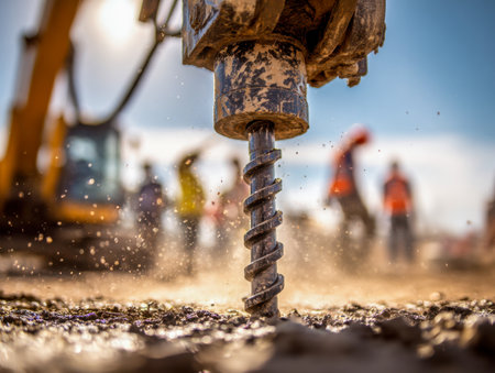 A powerful drill bit works its way into the earth, creating sparks and debris in a construction scene, showcasing the dynamic energy of the excavation process.