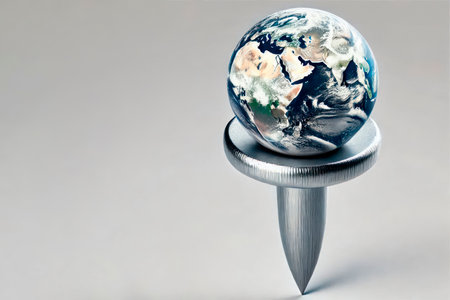 A close-up image of a miniature Earth globe partially submerged in sand, symbolizing the fragility of our planet and the need for care and responsibility towards its future.