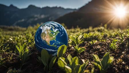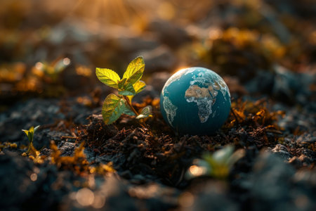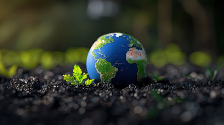 A small globe depicting Earth sits atop dark soil with a fresh green plant emerging from it, symbolizing growth and environmental care.