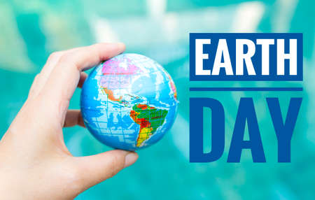 Earth day logo with plastic global ball in girl hand over blurred blue water background, outdoor day light, international earth day concept