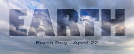 Lettering Earth Day April 22 on the background of sunset cloudy sky. Earth day concept, protection of the planet from pollution, improvement of environmental ecology and nature conservation.