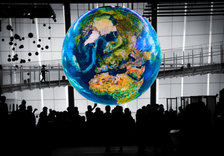 An interactive digital globe display in a tech expo, featuring touch-screen interfaces for exploring innovations across continents