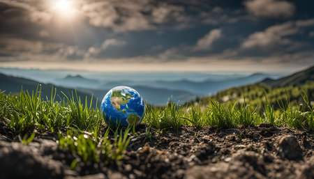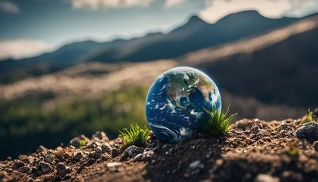 A close-up shot of a globe resting on the ground, surrounded by grass and rocks. The globe symbolizes our planet earth and the importance of protecting our environment. The image conveys a sense of hope and possibility for a sustainable future.