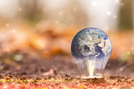 Ecology concept with copy space. Earth planet in light bulb. Global world innovation. Autumn background.