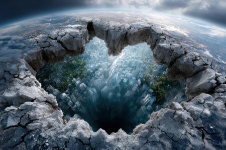 A massive hole in the Earth's crust reveals the planet's inner workings and the vast ocean beneath. The image is a stunning reminder of the Earth's power and beauty.