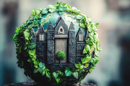A beautifully crafted wooden globe featuring a small house, illustrating the connection between home, nature, and our planet. Perfect for concepts of sustainability.