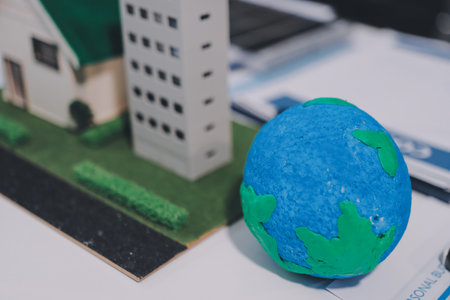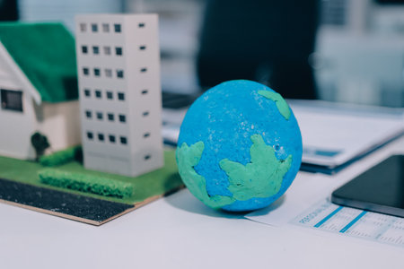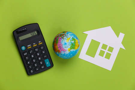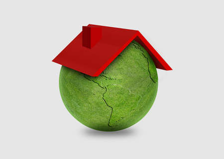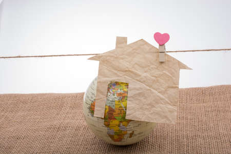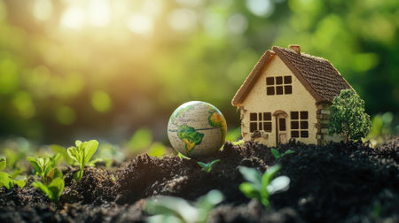 Model house with a world globe alongside in a conceptual image of saving the planet through eco-friendly construction and use of resources