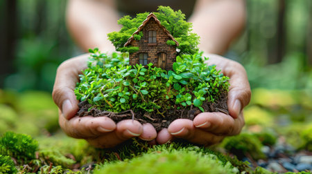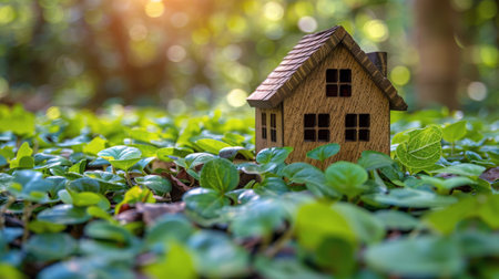 Miniature wooden house nestled in vibrant green moss, surrounded by serene forest atmosphere, evokes sense of tranquility and connection to nature