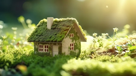 Small model house standing on moss at sunset symbolizing eco friendly home