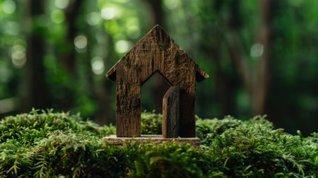 Miniature wooden house surrounded by lush green moss in serene natural setting, evoking sense of tranquility and harmony with nature