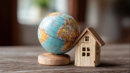 This image features a wooden house model beside a globe, symbolizing global travel, homeownership, and the connection between geography and lifestyle.