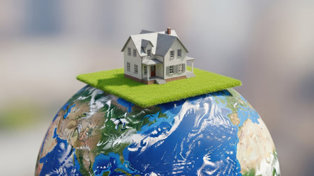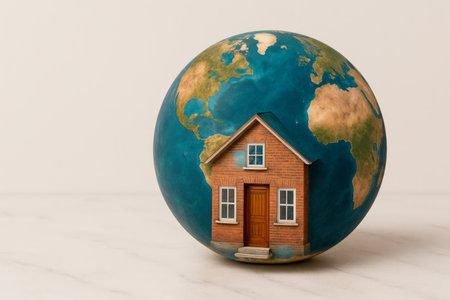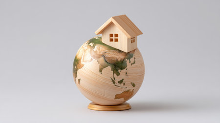 A wooden house model balanced on a globe symbolizes the connection between real estate and the global housing market, emphasizing sustainability in modern architecture.