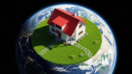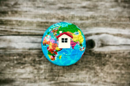 Little toy house on earth planet model. Motherland, ecology, property concept. Symbol of home