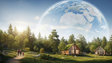 A family strolls towards cozy cabins in a vibrant outdoor scene. The composition features lush green trees, rolling hills, and a bright sky with a translucent Earth. The lighting suggests a sunny day. This image may be suitable for illustrating themes of nature, travel, or environmental concepts.