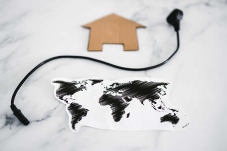 global and local connectivity and trade concept, house icon and world map with plug in between on marble background