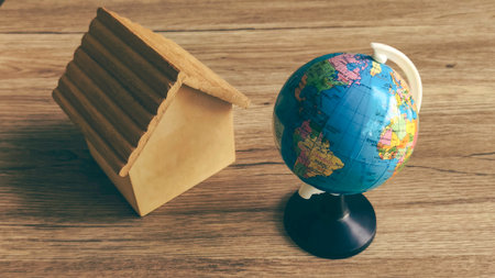This image features a wooden house model alongside a globe, symbolizing concepts of home, world travel, and the connection between local and global lifestyles.