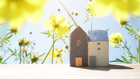 Close up wooden house growing in soil on green nature blur background. Home business grow up concept